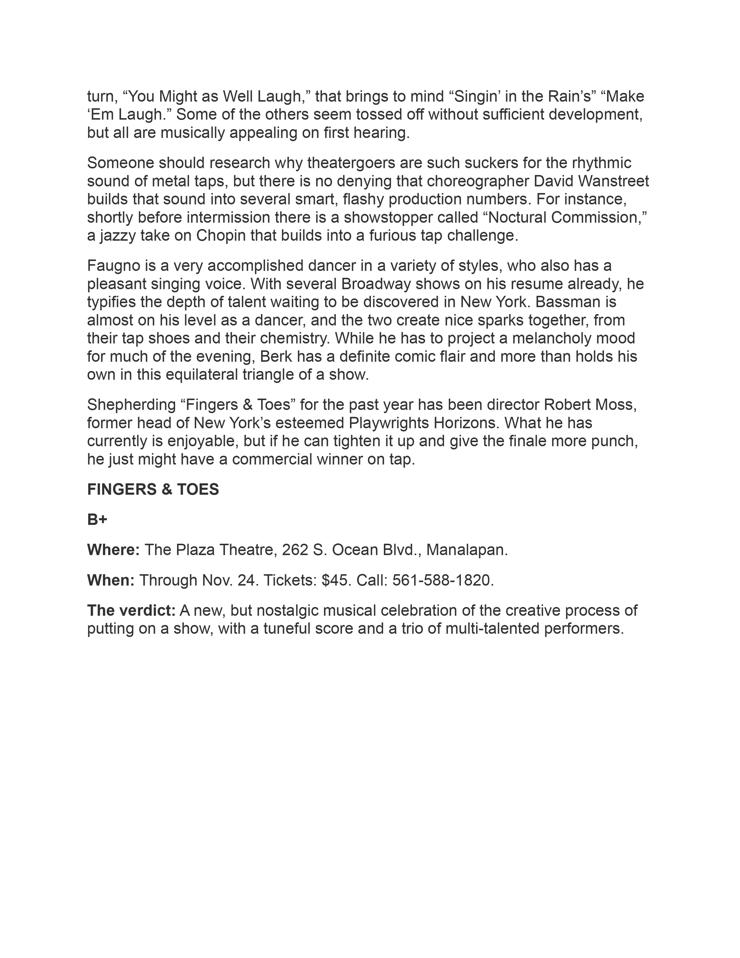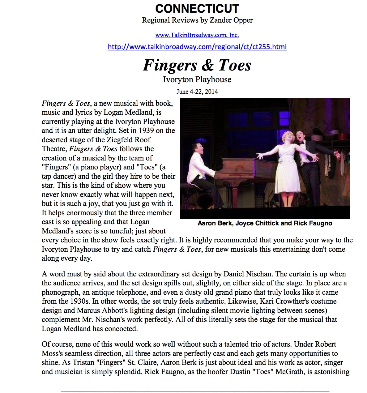"Fingers and Toes is an excellently turned out, old-style "Let'Put on a Show" story. Almost everything about it is well-executed and playful. It truly does have the spirit of an old MGM-style musical." Reviewsoffbroadway.com.