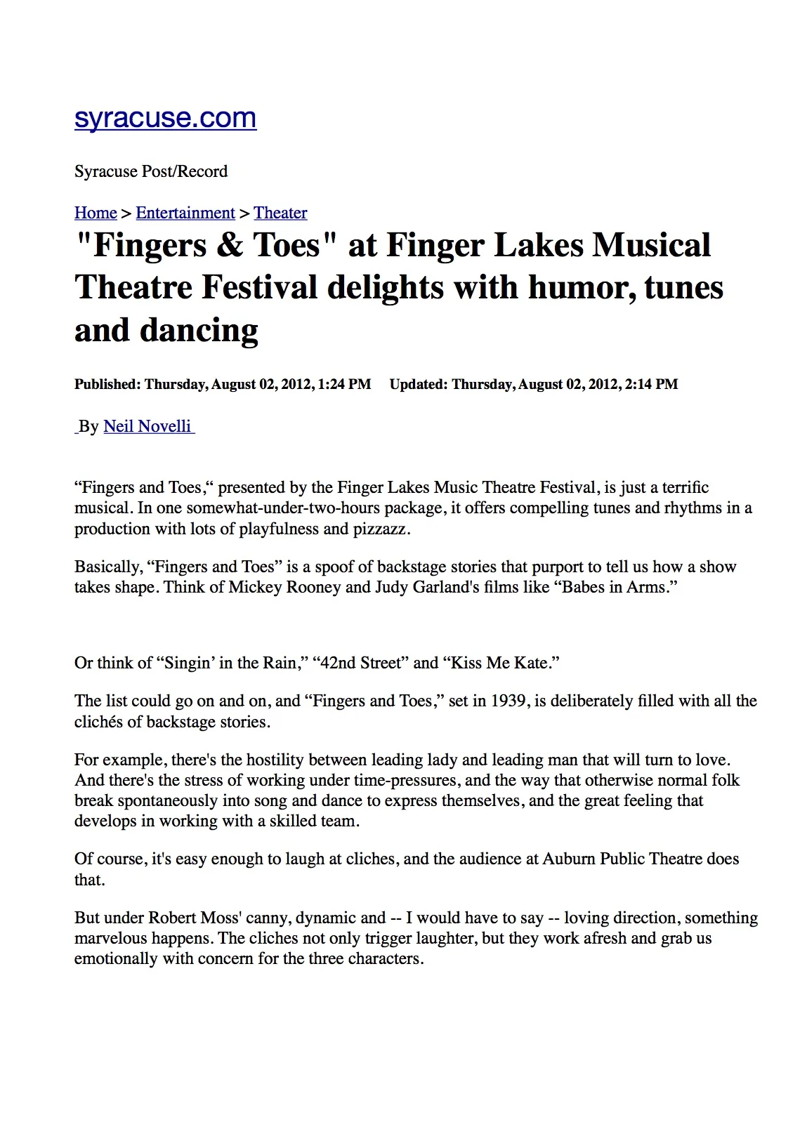 "Fingers and Toes is just a terrific musical." Neil Novelli, Syracuse Post/Record.